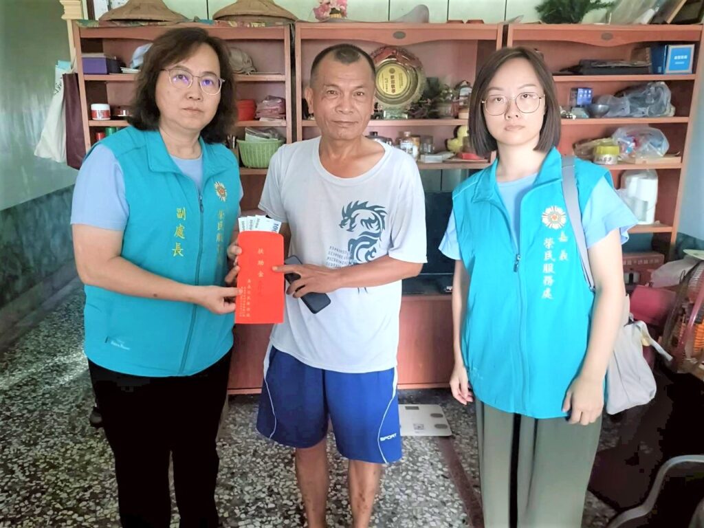 楊柳颱風過境後,嘉義榮服處於8/14日立即展開災後關懷行動,由副處長曾秀琴親自帶隊前往義竹鄉,探視在「楊柳」颱風中屋頂遭強風吹掀的823砲戰老兵柯姓長輩及屋頂漏水的莊姓榮民,曾副處長除致贈慰問金與生活物資外,也再次轉達退輔會主任委員嚴德發的關懷,並承諾持續協助縣府補助申請。