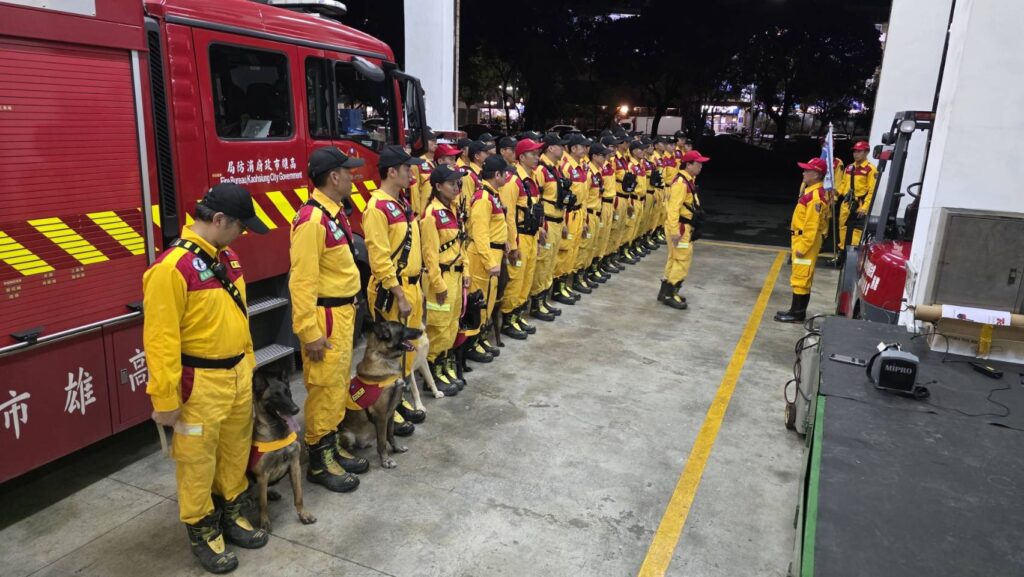 高雄市政府消防局特種搜救大隊於當日19時在蘇裕銘大隊長的帶領下緊急北上支援。此次救援行動規模龐大,動員了17輛車輛及45名專業人員,包括38名警消人員、3名義消,以及由1名醫師、2名護理師和1名獸醫組成的專業醫療團隊,以確保全方位的救援與醫療需求。救援設備方面,團隊攜帶了8艘救生艇及5隻經專業訓練的搜救犬。陳市長在隊伍出發前特別勉勵特搜隊員全力投入救援工作,把握每個救援機會,同時注意自身安全。