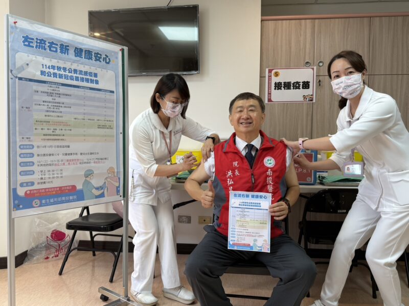 流感疫苗及新冠疫苗於今(1)日起同步開打。衛生福利部南投醫院在十月份起提供符合階段公費資格的民眾疫苗接種服務,該院洪弘昌院長也率先接受疫苗接種,鼓勵民眾踴躍接受施打,提升整體保護力。