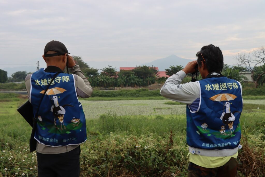 農業局在推動水雉棲地復育過程中,同時輔導「美濃區蔬菜產銷班第 18 班」成立全台第一個由農民組織成軍的「瀕危物種巡護隊」,專責守護美濃湖。計畫初期共有31 公頃野蓮池參與,至 113 年已有 87 公頃加入,建立了全台少見的大規模生態保育耕地。今年度農業局更推出「專屬」野蓮田生態服務給付,鼓勵農友在野蓮池中央加種菱角或芡實,吸引水雉築巢繁殖,避免孵化期與收成期衝突;在獎勵金方面,只要農友維護野蓮田符合友善標準,即可獲得每公頃 3 萬元的獎勵金,另有每年6萬元的巡守隊經費補助,鼓勵更多農民加入「護雉蓮盟」行列。