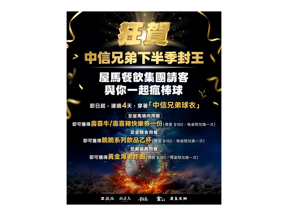 屋馬餐飲集團相關負責人表示,棒球運動所代表的團隊精神與堅持信念,與屋馬品牌長期強調的「共享幸福時光」理念相互呼應。這次限時優惠活動不僅是向中信兄弟隊封王致敬,更希望讓球迷能透過美食體驗,延續並放大勝利的喜悅。屋馬餐飲集團誠摯邀請所有棒球愛好者,在慶祝中信兄弟隊榮耀時刻的同時,也能在餐桌上與親朋好友共創難忘的歡樂回憶。