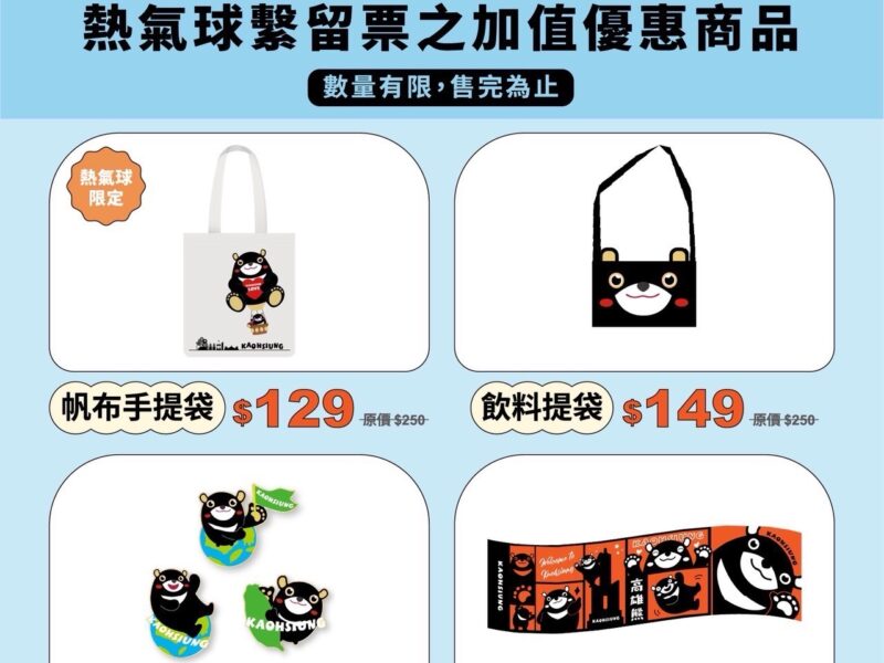 此外,本年度的「高雄愛.月熱氣球」更特別推出主題限定商品——「高雄熊熱氣球帆布袋」,活動現場還將販售高雄熊飲料提袋、運動毛巾、漁夫帽、徽章、小磁鐵等眾多可愛周邊;部分品項僅限購買繫留體驗票之民眾透過 ibon 或於活動現場以優惠價加購收藏。熊熊熱氣球商品數量有限,僅販售至10月12日止,歡迎大家把可愛的高雄熊紀念品帶回家!
