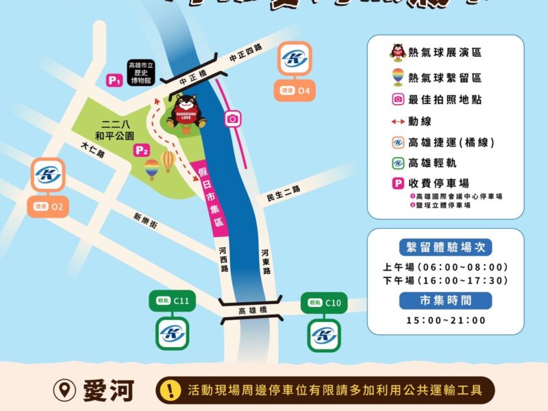 觀光局提醒,熱氣球展演及繫留活動將由專業團隊依天候狀況進行安全評估,受氣流、溫度及地形等因素影響,升空狀況可能有所調整,敬請民眾多加諒解。建議民眾多利用大眾運輸工具前往,可搭乘捷運橘線至鹽埕埔站或前金站步行抵達,亦可搭乘公車至愛河站下車,一同在雙十連假暢遊愛河,享受熱氣球、音樂與市集交織而成的浪漫假期。