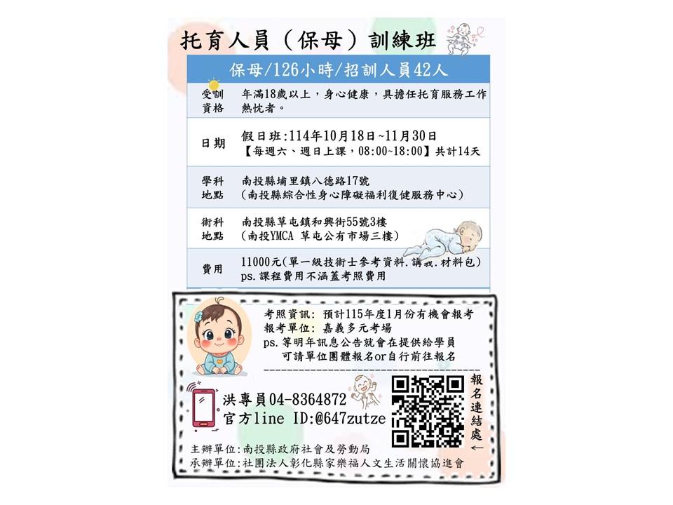 隨著社會對優質托育服務需求日益增加,南投縣政府積極推動專業托育人員培育計畫。無論您是新手父母、盼望學習新知的祖父母,或是想要培養第二專長的在職人員,都非常適合參加此次「114年托育人員職業訓練假日班—埔里班」。本縣特別與社團法人彰化縣家樂福人文生活關懷協進會合作,於114年10月18日至11月30日辦理訓練班,課程共計126小時,讓學員在短時間內建立紮實基礎。完成培訓者,未來更可報考專業檢定,提升就業競爭力,邁向專業托育人員之路。