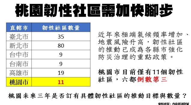針對防災議題, 9月23日花蓮馬太鞍堰塞湖潰決釀成重大災情,提醒桃園需加強韌性防災。目前桃園僅有11個韌性社區,在六都排名倒數第三;防災士人數及人口比例也居六都末位。他呼籲提供訓練補助或免學費方案,降低民眾參與門檻,並建立防災士與社區防災組織合作機制。消防局長龔永信表示,桃園防災士將納入相關社團,預計明年人數可達1萬多人。