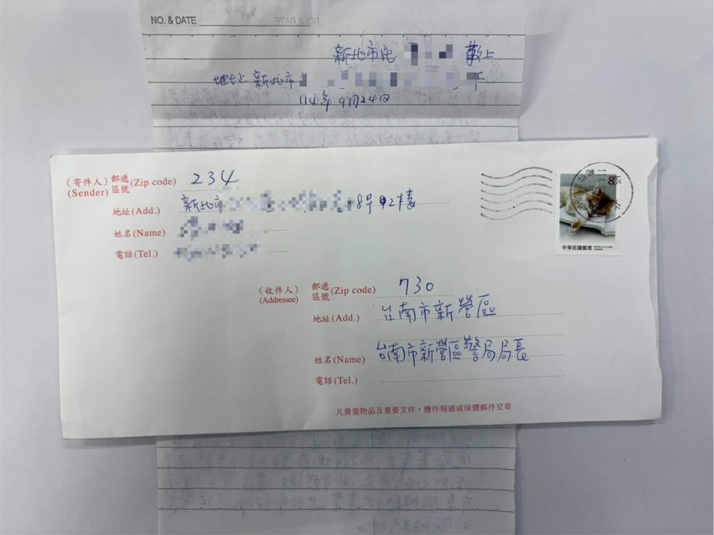 (News586/記者陳宥森報導)新營警分局10月8日接獲一封溫暖的感謝信函,稱許新營分局中山路派出所警員施品豪、陳其鴻及楊勝閎等3員將民眾遺失在公車客運上之行李箱迅速尋回,民眾回憶起此事特地手寫書信寄至警局感謝熱心幫忙的員警。