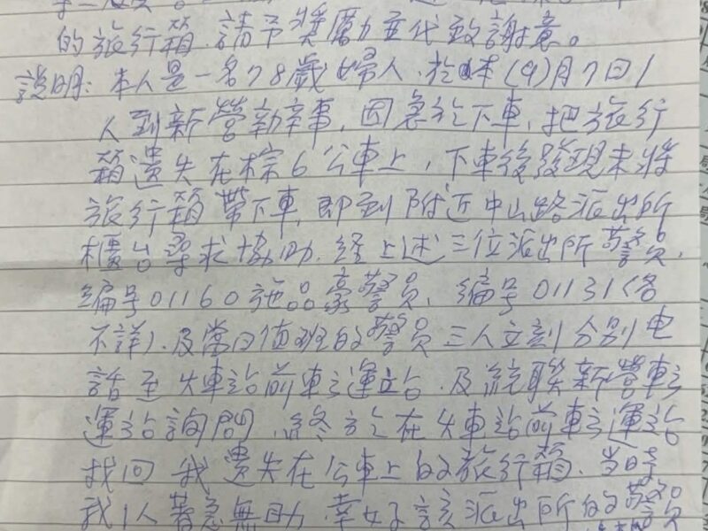 行李遺忘公車上 七旬婦書信感謝新營警協尋