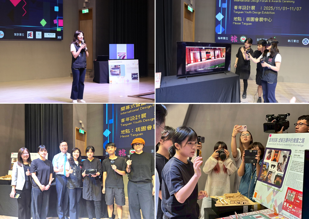 本次記者會首次公開由元智大學藝術與設計系的學生羅芷琳製作的《AI 作品模擬秀》影片,透過 AI 影像與聲音生成技術,重構11校 70 件學生作品,打造出契合主視覺的沉浸式影像體驗。影片帶領觀眾穿越時空,從文藝復興時期的創世靈感一路邁向 2050 年的永續城市願景,展現設計如何回應社會、文化與科技的演進。該影片也將於 11 月 1 日國際設計論壇開幕式中正式播放,作為本屆展覽的亮點之一。現場元智大學與平鎮高級中等學校分別搶先展示「聖境迴路:虛擬古蹟中的覺醒之路」及「AI 智能紙飛機實驗室」兩件作品。