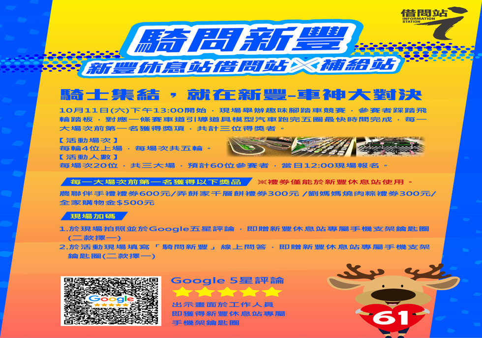 線上活動自114年9月17日至114年10月12日止,推出「騎問新豐」線上問答抽獎,參與者只要答對題目,即可參加抽獎,有機會獲得多項超值好禮。實體現場活動「車神大對決」則將於114年10月11日(星期六)下午1時在新豐休息站登場,邀請旅人報名挑戰體力極限,在互動中感受新豐的熱情與活力。
