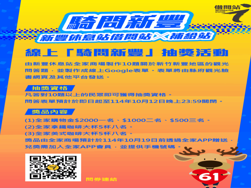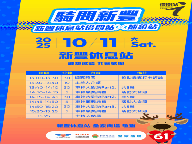為推廣「新豐休息站借問站 × 自行車補給站」的觀光特色與服務亮點,台61線新豐休息站全家商場在交通部公路局與北區養護工程分局指導下,結合交通部觀光署與新竹縣政府交通旅遊處共同舉辦「騎問新豐」系列活動。活動融合知識問答與體驗互動兩大元素,讓民眾在遊戲中了解在地風光,同時體驗運動樂趣與補給站的貼心功能。