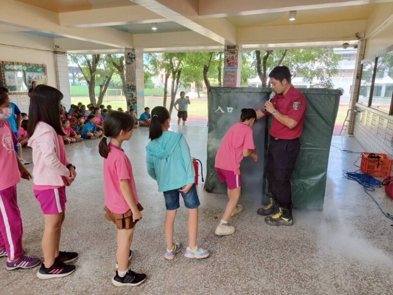 岡山宣導教官特別強調「小火快逃、濃煙關門」的安全秘訣,透過大型煙霧室,了解在煙霧中伸手不見五指,可能迷失方向的危害性、倉促逃生並非唯一做法,適時關門阻隔濃煙等待救援有時反而能大大提升存活率。後續亦實際體驗操作滅火器,讓學童了解滅火器的使用時機及操作方式。現場宣導成效極佳,也獲得熱情的回響,令學童了解面對緊急情況時應採取的應變措施。