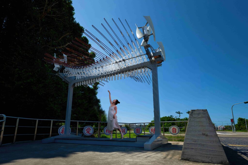 文化局進一步補充,豎立於清水眷村園區信義小站升旗台的風動裝置《風形之脈》,藝術家賴英翔利用沿海不息的強風,轉化為雕塑律動,以垂直軸風動裝置呈現風的能量;藝術家林資芬的《流變之景》運用海廢編織與地景環境的高低差距,重現潮間帶流動的自然姿態,此外,擅長纖維藝術的藝術家鍾瓊儀創作的《浮生圓境》,則以羊毛氈構築如苔蘚般的氣泡空間,融合親子共創的生物圖騰,打造柔軟且充滿生命感的感官場域。