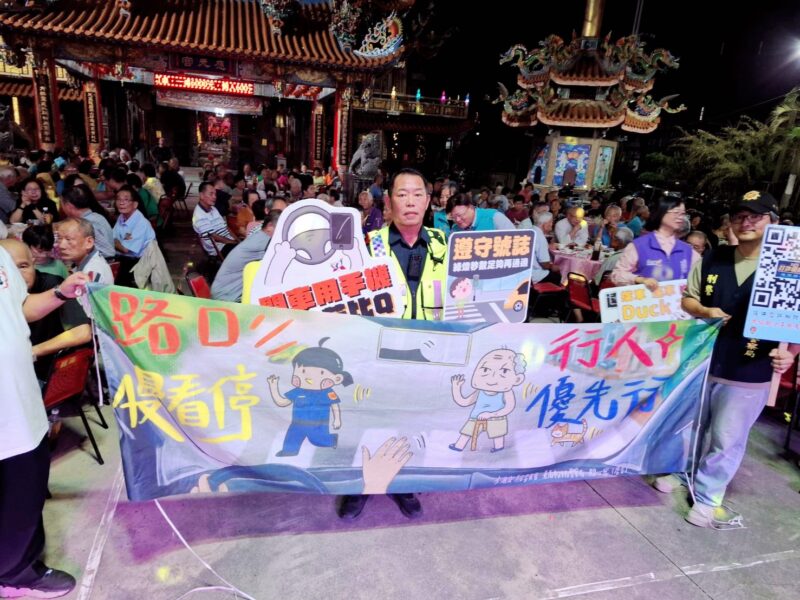 佳里警分局也受邀到場,向現場長者實施交通安全及反詐騙等政令宣導。餐會開始,先由佳里分局交通組向現場長者進行交通安全宣講,透過圖卡解說,讓現場長者了解「大車轉彎死角」以及「路口慢看停,行人停看聽」等交通安全觀念,交通組也向現場長輩大聲疾呼,不論今天是駕駛交通工具或是行人角色,都應遵守交通規則,千萬不可因為鄉下人車稀少,而忽視路口人車或是超速行駛。