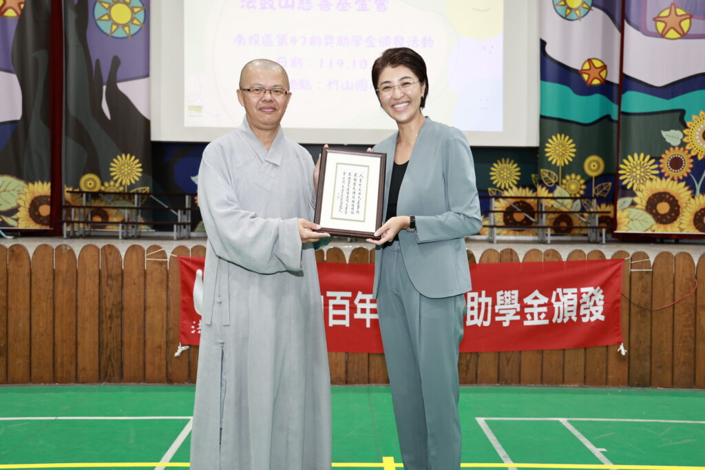 財團法人法鼓山慈善基金會於10月18日上午在南投縣竹山國小舉辦「法鼓山百年樹人獎助學金」頒發典禮,濁水溪線學校近百位學子到場接受表揚。南投縣長許淑華親臨現場頒發感謝狀予法鼓山慈善基金會,由秘書長常惺法師代表受領。