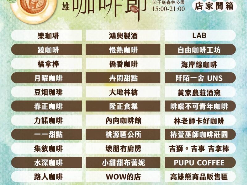 主辦單位今(22)日率先公布了本屆的參展陣容,共有60家高雄超人氣的咖啡與甜點品牌強勢集結,內容豐富多元,從展現高雄原鄉部落特色的在地咖啡、屢獲國際殊榮的世界冠軍級職人咖啡,到充滿獨特質感與風格的獨立咖啡店,以及優質糕點、咖啡器具等,讓蒞臨的民眾得以一站式滿足對咖啡的所有美好想像。