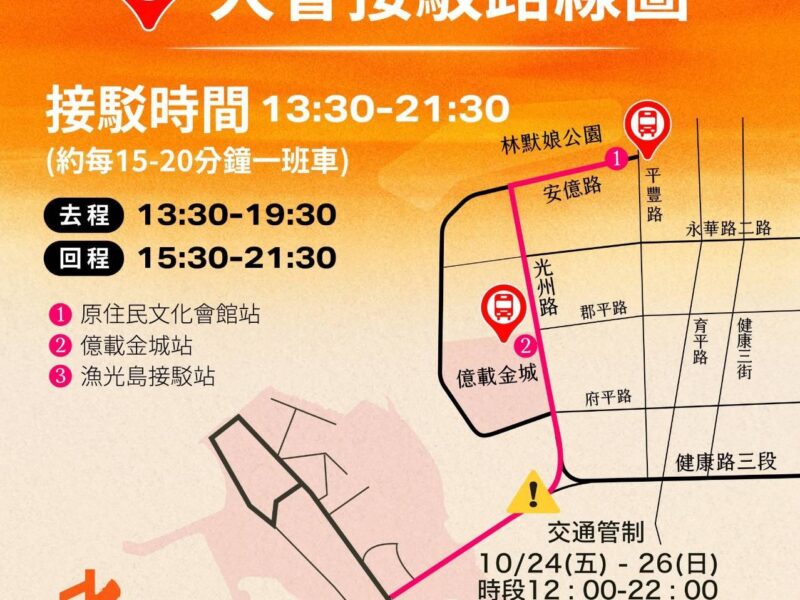 為維護活動期間交通順暢與民眾安全,市警局第四分局將與交通局即時監控路況,於活動期間在周邊道路視車流狀況進行彈性管制,確保行車動線順暢並紓解車流,24日至26日活動期間漁光橋每日12時至22時進行交通管制措施,除緊急車輛、公務車輛、接駁車及當地住戶等,禁止車輛進入,請參與民眾預先於活動周邊停車後,可於原住民文化會館、億載金城前接駁站搭乘活動接駁車或步行入島;建議民眾多加利用大眾運輸工具前往,並配合現場交通指揮人員引導,以確保交通順暢及活動安全。