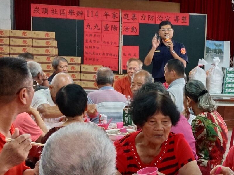 (News586/記者陳宥森報導)火馬的故鄉情意最熱,敬老溫情滿滿!後壁區崁頂社區今(27)日中午舉辦「114年重陽節敬老活動」,長輩們齊聚一堂共享佳餚,現場洋溢著濃濃人情味。白河警分局應邀前來宣導交通安全及防詐騙觀念,為這場溫馨的敬老盛宴注入一股守護平安的力量。