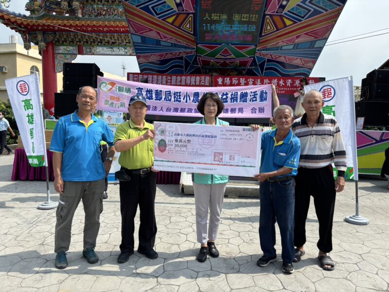 【News586/記者張淑慧報導】高雄郵局於10月27日中午在高雄市大樹區興田里保隆宮前廣場舉辦「114年i郵購關懷農產行銷玉荷包市集」挺小農做公益捐贈儀式。大樹區農民李義輝及莊分彬兩位小農代表捐贈善款,由李榮恭理事長代表受贈,尤素珍局長擔任儀式見證人。善款分別贈予私立大慈育幼院、財團法人創世社會福利基金會及大樹區興田社區發展協會送餐服務專戶各3萬元,合計捐出9萬元,用於弱勢兒童輔助、救助植物人及社區老人送餐服務,傳遞郵政關懷與溫暖。