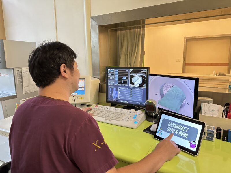 此外,為打造安心檢查環境,CT室內增設微電腦投影機,播放輕音樂降低病人不安情緒,對孩童播放童歌或卡通轉移注意力;對聽障病人則將須配合的指示字幕投射至頂幕,透過字幕溝通減少不安,協助配合吸閉氣,獲得良好影像品質。
