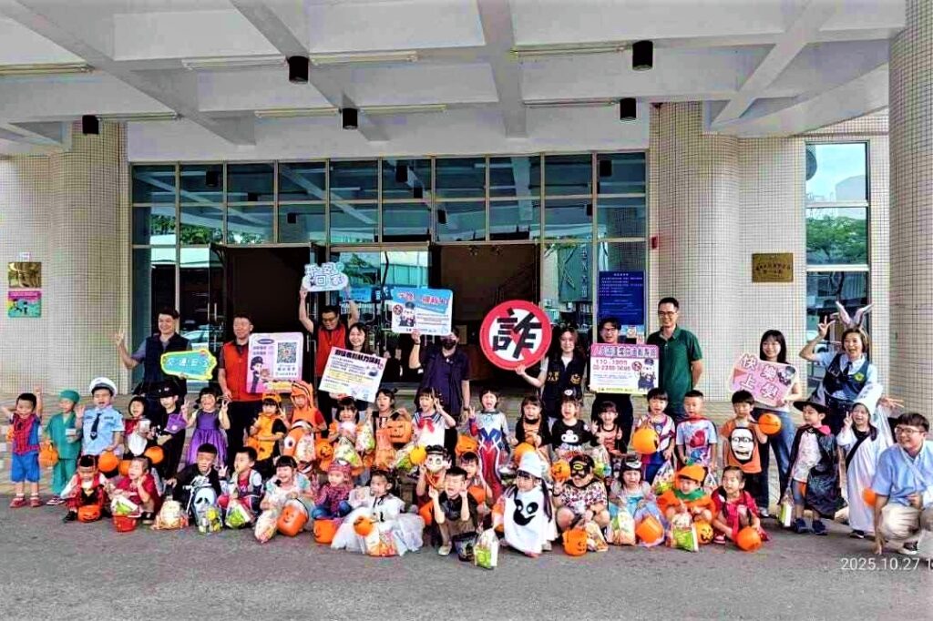 〔News586/記者陳允得嘉義市報導〕萬聖節變裝熱潮開跑,美的幼兒園來到嘉義市政府警察局第一分局搗蛋要糖果,警察叔叔、阿姨以遊戲和問答互動的方式,向孩子們介紹「網路點數詐騙」和「性影像剝削」等危險陷阱,提醒大家上網一定要謹慎、不輕易提供個資,現場還教導小朋友正確的行人過馬路方式,透過實際示範和有獎徵答,讓學習變得更有趣,讓小朋友們在開心拿糖果的同時,也能學會「聰明不上當、安全又平安」。