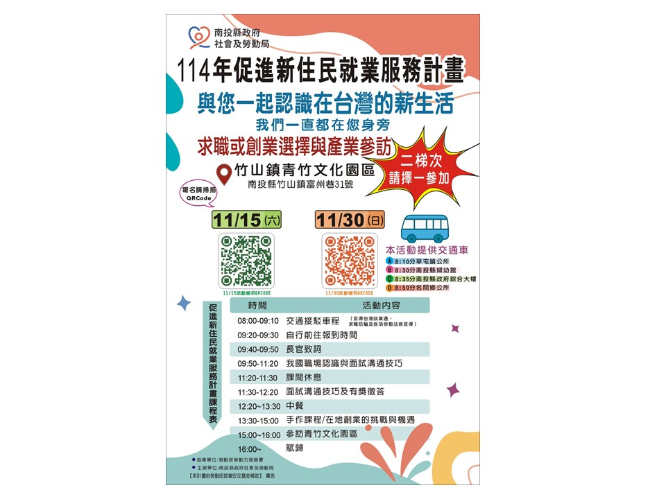 趕快來報名參加南投縣政府規劃的「114年新住民就業服務計畫」,於今(114)年10月16日起已經熱烈展開,地點在竹山鎮青竹文化園區(南投縣竹山鎮富州里富州巷31號),還有二個梯次正受理報中,為配合新住民照顧家庭之需求選擇在假日舉辦,分別為11月15日(星期六)、11月30日(星期日),每梯次名額25人額滿為止。