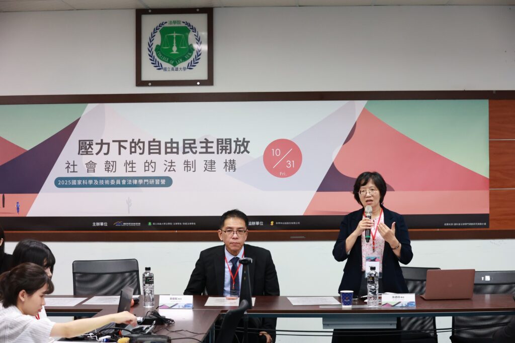 高雄大學學術副校長莊琇惠代表校方致詞,指出本次研習營切合當前法學研究的核心課題。現代社會高度複雜,單一領域的專業已不足以應對多變的現實問題,國科會長期推動的整合型研究方向極具前瞻性。莊琇惠表示,建構具韌性的法治體系,必須結合法律、政治、社會與科技等跨領域知識,使制度在戰爭、災害或資訊威脅下仍能維持運作與信任。她肯定此次研討會匯聚19位專家學者主持與報告,展現法律學門在跨域整合與理論深化上的努力,並期勉與會者提出具體成果,強化臺灣法治體系的韌性基礎。
