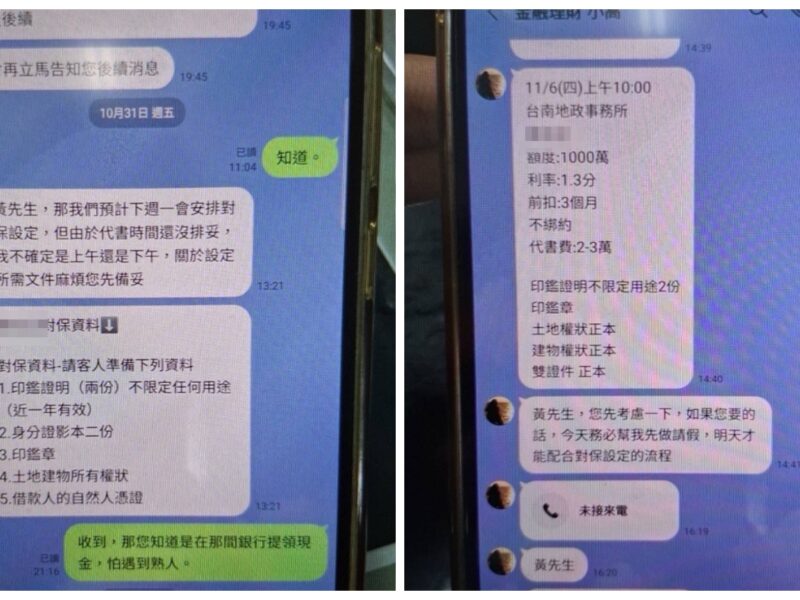 據了解,黃姓男子為籌措創業資金,透過網路尋求借貸協助,並與自稱「金融理財小高」的男子以LINE聯繫約一個月,對方聲稱可提供利率僅1.3%的「低利貸款」,並指示黃男前往超商機台列印申辦文件,簽署後以傳真方式往來,待資料齊全後再至地政事務所辦理抵押設定。地政人員發現黃男對貸款內容答覆反覆,且文件多處可疑,懷疑其遭詐,遂即通報警方到場。