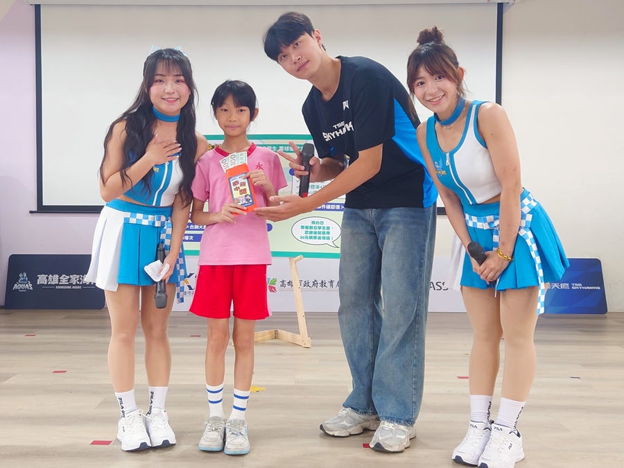 圖/永芳國小李同學代表接受粉絲團留言抽獎獎品,並與Wing Stars啦啦隊玖玖(左一)、會晴(右一)、台鋼天鷹球員張庭輔(右二)一同合影。