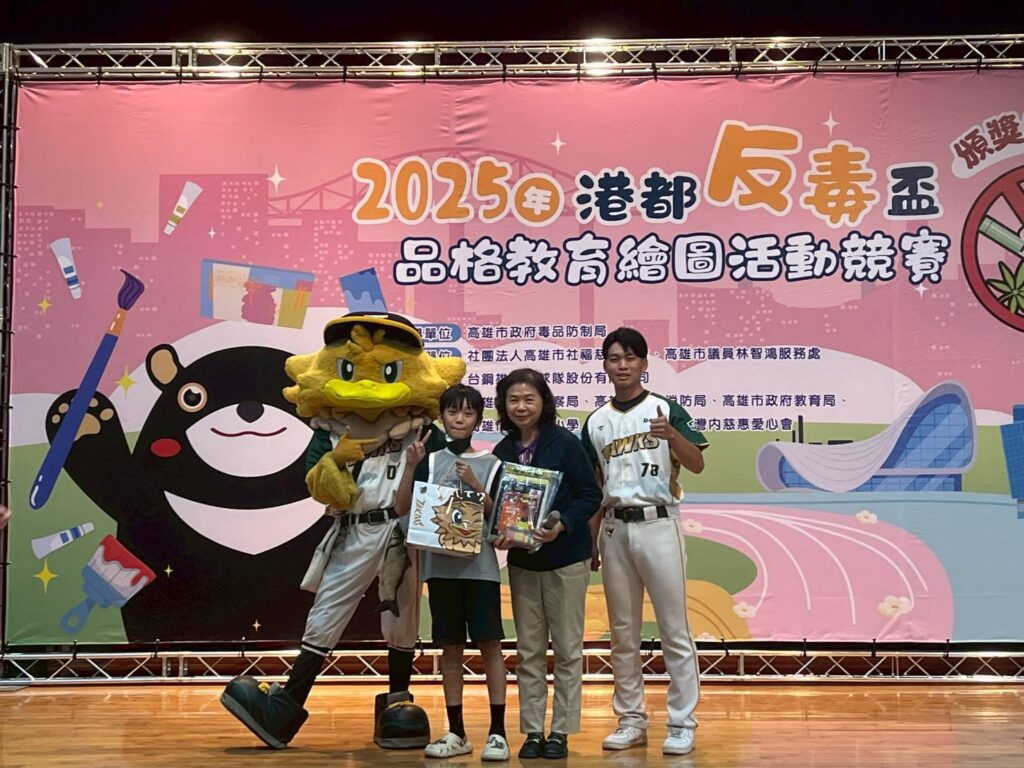 【News586/記者張淑慧報導】高雄市政府毒品防制局攜手高雄市社福慈善總會,共同舉辦「2025港都反毒盃品格教育繪圖競賽」,並於暑假期間推出「反毒小畫家宣誓活動」。活動中邀請過去得獎者分享創作理念與參賽心得,吸引全市國小學生踴躍參與,最終共收到3,989件投稿作品。經專業評審評選,選出特優、優等及佳作等優秀作品。昨(23)日於鳳山行政中心大禮堂舉行頒獎典禮,吸引超過300位親子參與。現場安排了反毒宣導、有獎徵答活動,並邀請台鋼雄鷹吉祥物TAKAO及選手陳世嘉到場助陣,氣氛熱鬧溫馨。此外,活動設有保齡球、套圈圈等反毒闖關遊戲,讓孩子在輕鬆的遊戲中學習毒品防制知識。社福慈善總會理事長李昭揚、教育局局長吳立森、議員林智鴻,以及立委許智傑、林岱樺與邱議瑩的團隊均到場支持。