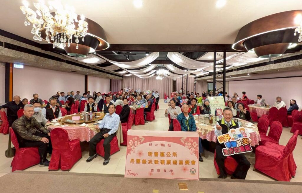 (News586/記者陳宥森報導)丹娜絲颱風於7月挾帶強風重創台南溪北地區,新營區多處受災嚴重,造成大規模停電、路樹倒塌與屋頂毀損。災後復原歷經艱辛,感謝公私協力、各界企業團體及志工等單位通力合作,迅速展開災後重建,為感謝各界支援,新營區公所於11月27日舉辦「丹娜絲災後復原感恩餐會」,向所有在災後伸出援手的夥伴致上最深的敬意與感謝。