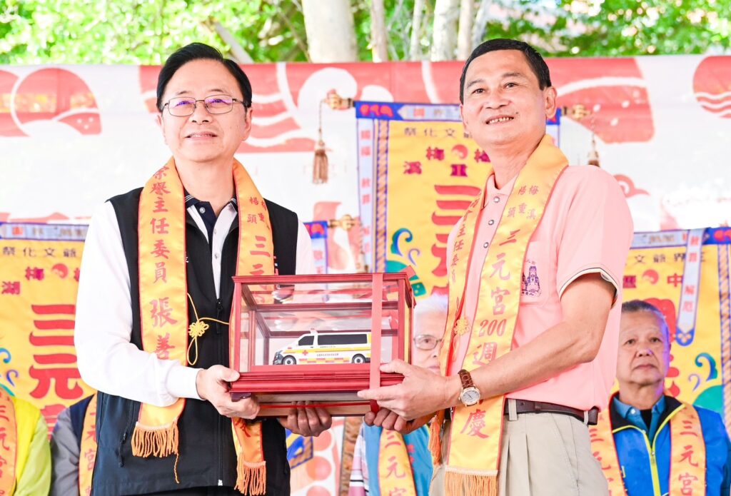 張市長也特別感謝頭重溪三元宮主委吳錦鴻長期投入公益,此次三元宮更捐贈楊梅埔心分隊及富岡分隊兩部全新救護車,協助市府強化救護量能,為在地鄉親提供更即時、完善的緊急醫療後送服務。