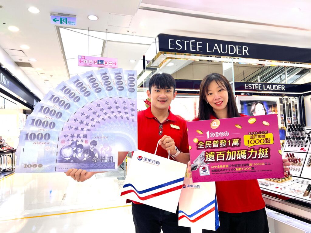 全民普發1萬遠百加碼力挺,即日起至十二月三十一日止,遠百APP金級會員於全館當日消費滿1萬元送HAPPY GO點數1000點,搭配既有的感恩禮讚滿千送百或銀行卡友禮,回饋率再往上堆疊,讓您的普發萬元瞬間「放大」成超值驚喜的購物金!
