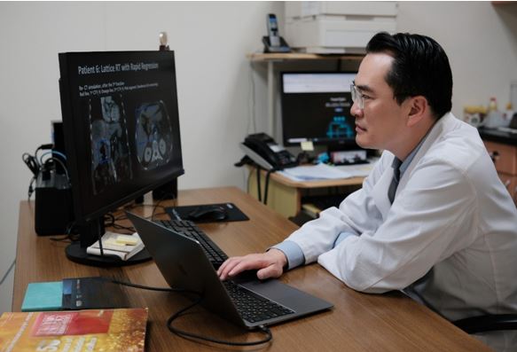高雄榮總導入的放射治療銳視刀系統搭載超大面板高解析影像技術,能在治療機上直接完成定位與治療。林醫師舉例,一位頭頸癌病患在療程中腫瘤體積縮小、腮腺位置改變,透過每日治療前影像比對,醫師即時調整照射範圍與劑量,避免正常組織暴露輻射,病患追蹤情形良好,生活品質明顯提升。