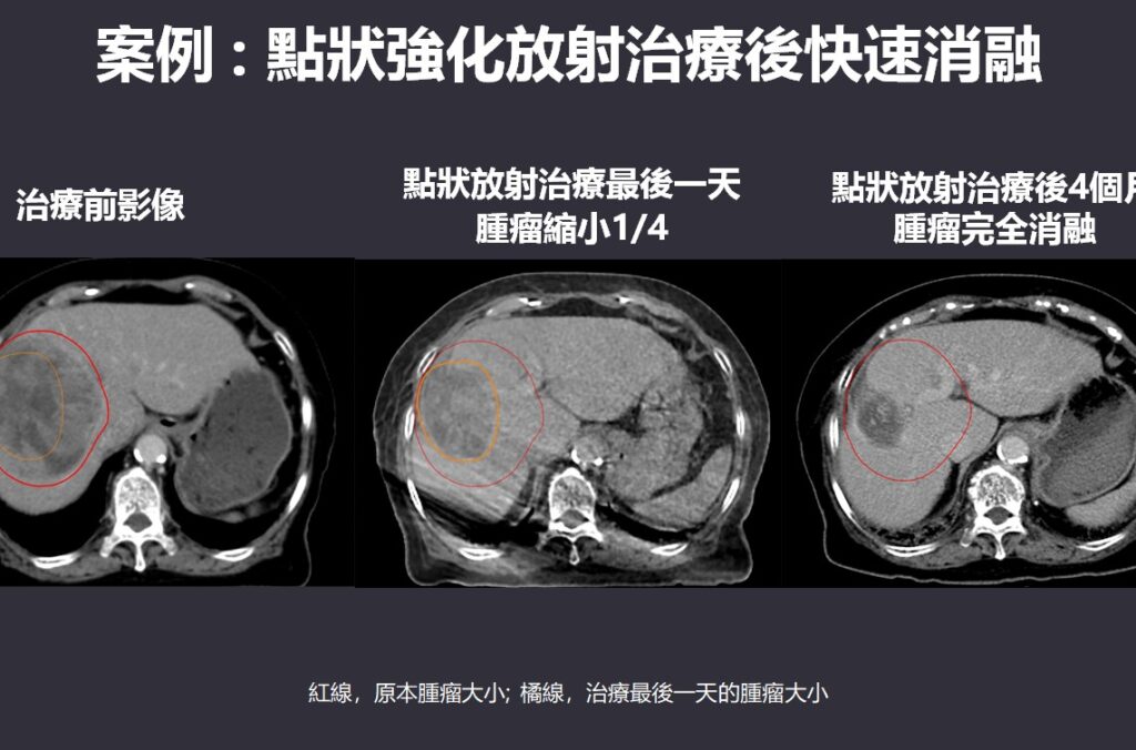 針對體積較大的腫瘤,高雄榮總採用空間分割放射治療(SFRT)技術,在同一腫瘤中設計高、低劑量分布。林醫師分享一例90多歲高齡肝癌病患,腫瘤體積達460立方公分如中型葡萄柚大小,透過空間分割放療將高劑量鎖定腫瘤核心、低劑量包覆周邊,並搭配免疫治療。治療後僅兩週腫瘤明顯縮小,四個月後幾乎消失,病患追蹤情況良好。