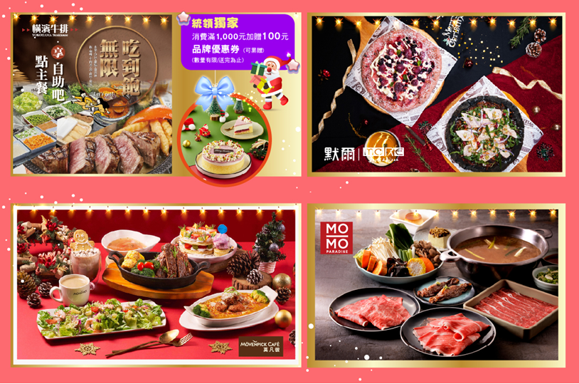 聖誕佳節到來,少不了多人聚餐及聖誕氛圍,3F「莫凡彼」推出聖誕浪漫饗宴,特價$1,388;6F「MOMO PARADISE」推出聖誕雙人和牛饗宴,套餐每人$950;5F「燒桶子」推出聖誕四人分享餐,推薦價$2,599;5F「聚 日式鍋物」推出統領獨家,點雙人肉肉瀑布系列主餐,贈鮮魷乙份;6F「默爾Pasta&Pizza」推出雪莓粉紅派對披薩、極黑金燦披薩,兩者推薦價$460;8F「OHMY原燒」推出初雪和牛聖誕樹,推薦價$499;5F「喜魚 酸菜魚 金椒麵」推出統領獨家,凡點購主餐「中盛」雙倍肉系列,直接免費升級「極盛」三倍肉!7F「橫濱牛排」推出統領獨家,消費滿千加贈100元品牌優惠券、聖誕節限定莓果優格生乳酪蛋糕,橫濱會員價$500。