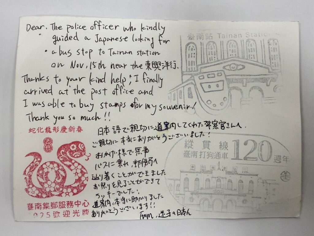 (News586/記者陳宥森報導)臺南市政府警察局第四分局近日收到一封別具意義的感謝信,這封來自日本遊客的感謝信,以英語、日本語書寫,記錄著一段溫馨的異鄉相遇,該名遊客上個月在安平遊玩時迷路,遇到遶境活動交通繁忙,獲得警方熱心協助而順利搭上公車抵達目的地,更意外欣賞到臺南特有的廟會祭典,她將自己的驚喜與感謝化作真誠的文字表達寄回第四分局,字裡行間流露著真摯的感激之情,感謝安平警的溫柔守護,這份跨越語言與國界的溫暖,不僅讓這位遊客留下美好的旅行回憶,也讓收信的第四分局員警倍感溫暖。