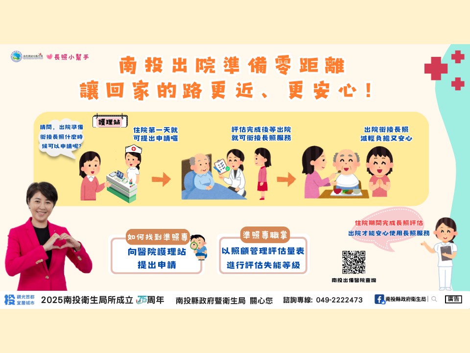 住院民眾有長照服務問題可洽詢醫院出院準備團隊或電洽全國長照專線:1966,即可轉接至各縣市照管中心,亦可電洽南投縣政府長期照顧管理中心專線049-2209595;另可多加利用南投縣政府網路E櫃檯https://eservice.nantou.gov.tw/ 搜尋【長期照顧服務個案申請】。