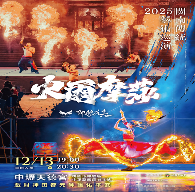【News586/記者彭慧婉報導】由桃園市政府文化局主辦的「2025閩南傳統藝術巡演」,將於12月13日(星期六)晚間19時(18時開放入場),在中壢天德宮(中壢區中正路四段15-5號)隆重登場!本次活動特別配合天德宮戲財神田都元帥護佑平安,邀請國內指標性火舞團隊「即將成真火舞團」帶來震撼大作《火爾摩莎》,邀請市民朋友在冬夜共賞融合民俗信仰與當代表演藝術的熱力盛宴。
