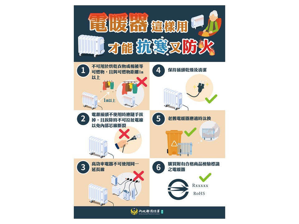 • 購買具合格商品檢驗標識之電暖器(如R字號、RoHS標章)。